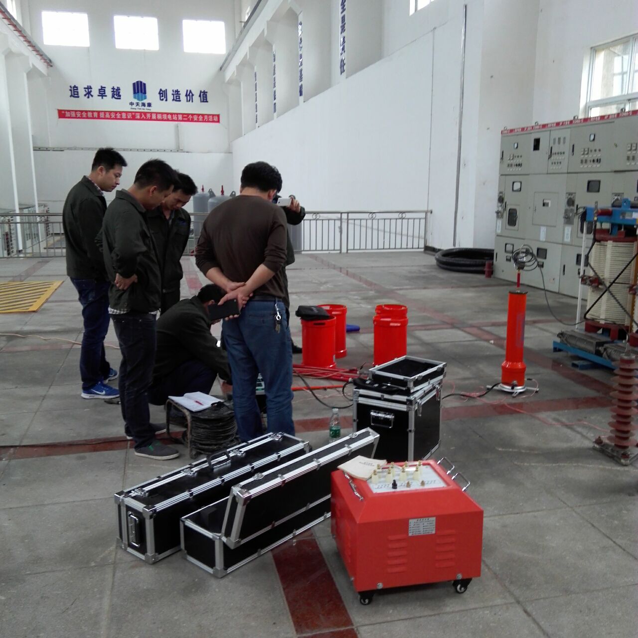 此次培訓的重點設(shè)備是YTC850-135kVA/108kV變頻串聯(lián)諧振試驗裝置。我公司的該設(shè)備為專利產(chǎn)品,諧振電源調(diào)頻及功率元件使用先進的日本進口的優(yōu)質(zhì)元器件,設(shè)計的是諧振式濾波電路,能改善輸出電壓的波形畸變,獲得很好的正弦波形,有效的防止了諧波峰值對試品的誤擊穿。變頻電源保護功能強,穩(wěn)定性好;具備具備全自動(自動調(diào)諧、自動升壓)、全手動(手動調(diào)諧、手動升壓)以及半自動(自動調(diào)諧、手動升壓及手動調(diào)諧、自動升壓)的多種工作模式,可任意切換使用;操作方便;采用220V或380V單相電源,方便現(xiàn)場取電。