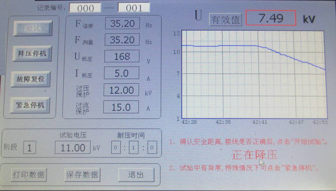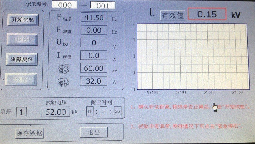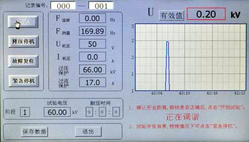 點(diǎn)擊“開(kāi)始試驗(yàn)”,系統(tǒng)自動(dòng)尋找諧振點(diǎn),右下角提示“正在調(diào)諧,如有異常情況,請(qǐng)點(diǎn)擊“降壓停機(jī)””;藍(lán)代表電壓曲線,顯示界面如圖所示